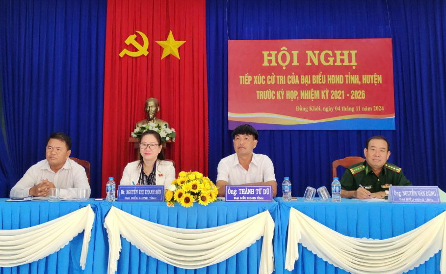 Tại buổi tiếp xúc, cử tri xã Đồng Khởi kiến nghị đến các đại biểu HĐND tỉnh, huyện một số vấn đề: tuyến đường D38 (đoạn thuộc tổ 15), đường vào trại heo (thuộc tổ 14, ấp Tua Hai), đường vườn dầu (tổ 14 ấp Cầy Xiêng) vào mùa mưa thường hư hỏng, gây khó khăn cho người dân khi đi lại; lắp đặt hệ thống đèn chiếu sáng đoạn đường gần trường Tiểu học Bùi Xuân Quyên, tuyến quốc lộ 22B đoạn từ ấp Tua Hai đến giáp xã Trà Vong và tuyến đường 788 từ ngã ba Vịnh hướng về xã An Cơ để bảo đảm an toàn cho người đi đường.