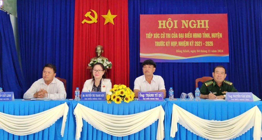 Tại buổi tiếp xúc, cử tri xã Đồng Khởi kiến nghị đến các đại biểu HĐND tỉnh, huyện một số vấn đề: tuyến đường D38 (đoạn thuộc tổ 15), đường vào trại heo (thuộc tổ 14, ấp Tua Hai), đường vườn dầu (tổ 14 ấp Cầy Xiêng) vào mùa mưa thường hư hỏng, gây khó khăn cho người dân khi đi lại; lắp đặt hệ thống đèn chiếu sáng đoạn đường gần trường tiểu học Bùi Xuân Quyên, tuyến Quốc lộ 22B đoạn từ ấp Tua Hai đến giáp xã Trà Vong và tuyến đường 788 từ ngã ba Vịnh hướng về xã An Cơ để bảo đảm an toàn cho người đi đường.