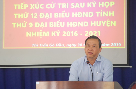 Tại buổi tiếp xúc, cử tri kiến nghị đến các đại biểu việc thi công dự án bờ kè khu vực thị trấn Gò Dầu có thực hiện hay không; cánh đồng Bàu Thác Lác ( khu phố Thanh Hà) có một số hộ sản xuất nông nghiệp, nhờ nguồn nước tưới của kênh N18-20, tuy nhiên trong vụ Đông xuân 2018-2019 lại không có nước kênh về để phục vụ cho sản xuất, nguyên nhân do đâu; đề nghị lắp hệ thống đèn giao thông tại khu vực Trung tâm Y tế huyện, do ở đây thường xuyên xảy ra các vụ TNGT.