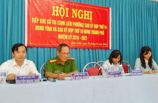* Tại UBND phường Hiệp Ninh, các đại biểu HĐND tỉnh gồm ông Nguyễn Hoàng Nam- Phó Giám đốc phụ trách Sở Tư pháp, Đại tá Lý Hồng Sinh- Phó Giám đốc Công an tỉnh cùng tổ đại biểu HĐND thành phố Tây Ninh có buổi tiếp xúc với cử tri phường Hiệp Ninh và Ninh Thạnh, TP.Tây Ninh sau kỳ họp thứ 14 HĐND tỉnh khóa IX và kỳ họp thứ 10 HĐND thành phố khóa XI, nhiệm kỳ 2016 – 2021.