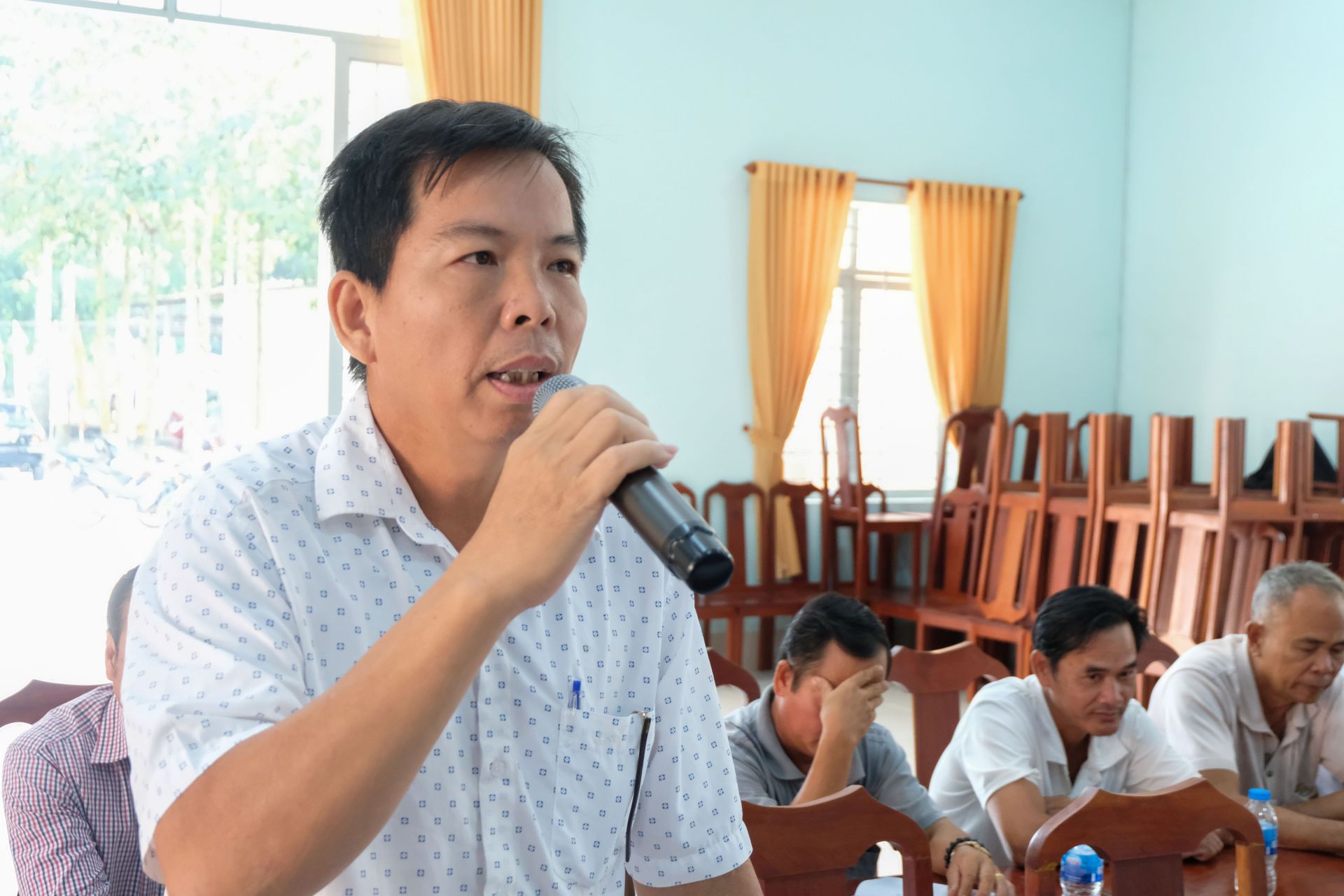 Cử tri xã Hưng Thuận phát biểu ý kiến tại buổi tiếp xúc.