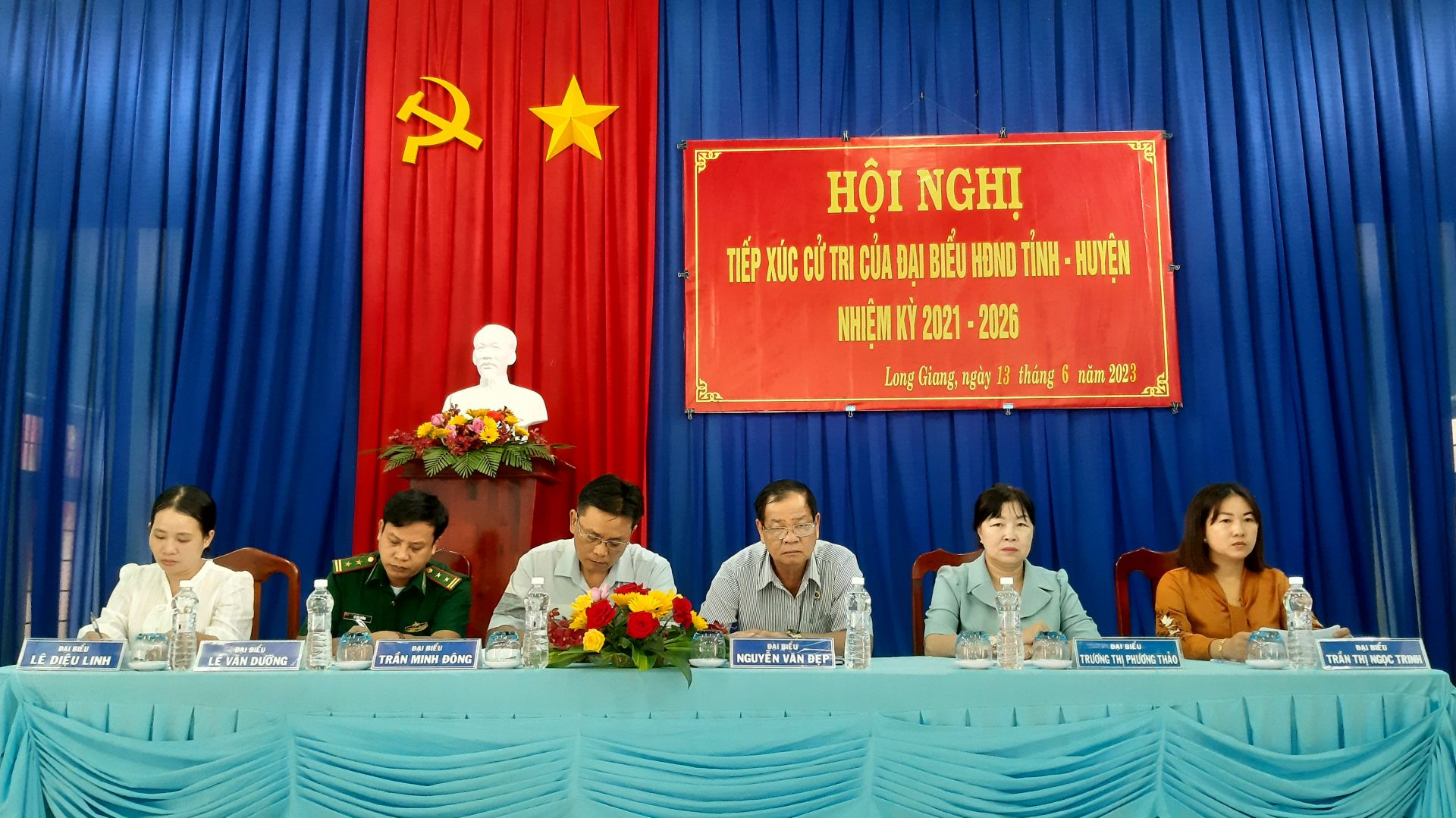 Tại buổi tiếp xúc, cử tri xã Long Giang có 6 ý kiến, kiến nghị về 10 vấn đề như: Đề nghị làm kênh tiêu thoát nước cặp bờ tả tuyến kênh Long Khánh 8 đến tuyến kênh chính Long Khánh-Long Giang để phục vụ cho cánh đồng sản xuất lúa ở ấp Bảo; làm sỏi phún tuyến đường Long Giang 9 đến ruộng ông Hướng thuộc ấp Bảo; xử lý nước ngập cục bộ đoạn đường giáp tỉnh lộ 786 đến bãi cát Nguyễn Huynh ở ấp Xóm Khách;