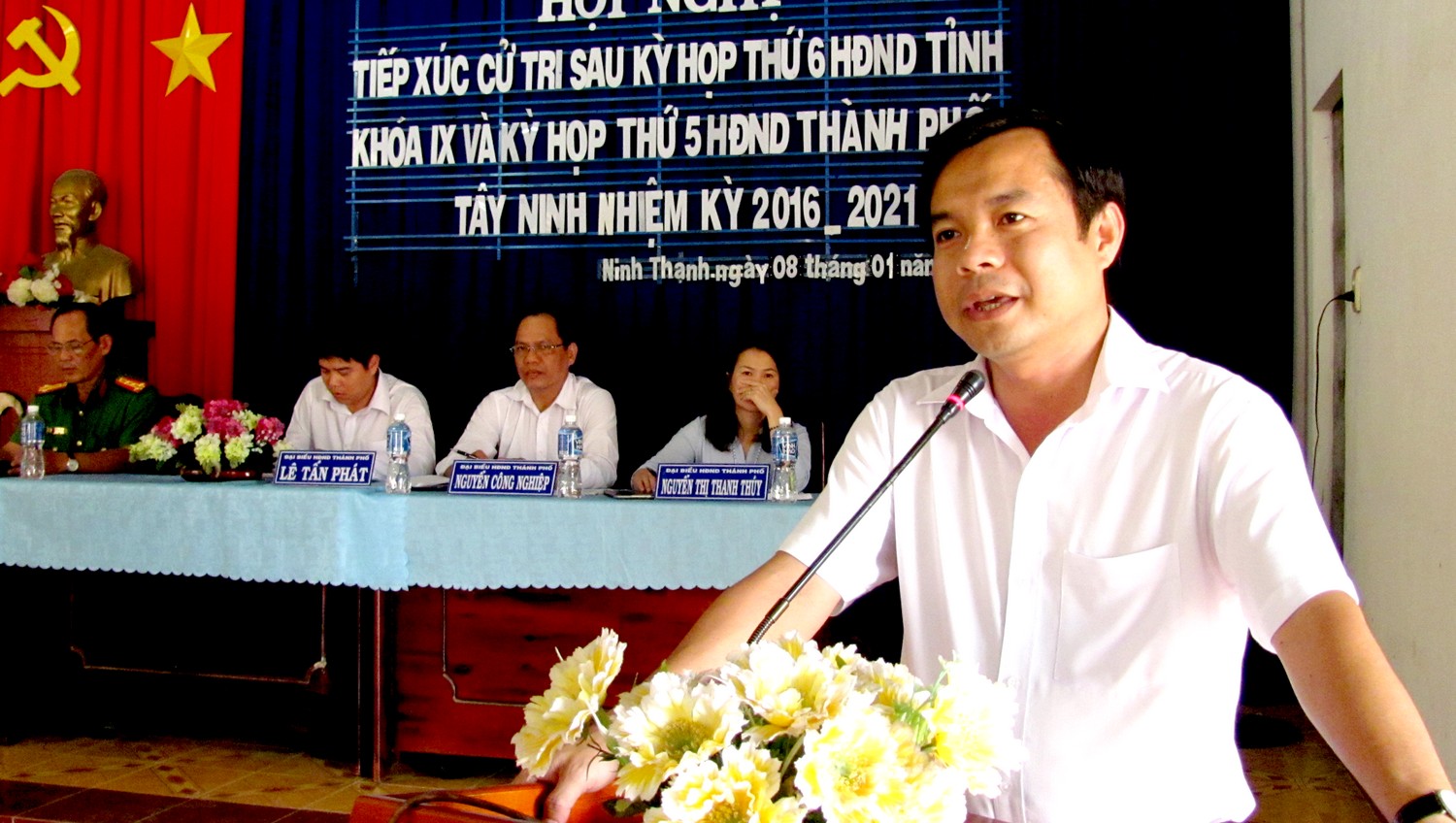 * Chiều cùng ngày, các đại biểu HĐND tỉnh gồm các ông Nguyễn Hoàng Nam- Phó Giám đốc Sở Văn hóa Thể thao và Du lịch Tây Ninh, Lý Hồng Sinh-Phó Giám đốc Công an Tây Ninh và các đại biểu HĐND Thành phố có buổi tiếp xúc với cử tri phường Ninh Thạnh và Hiệp Ninh, thành phố Tây Ninh