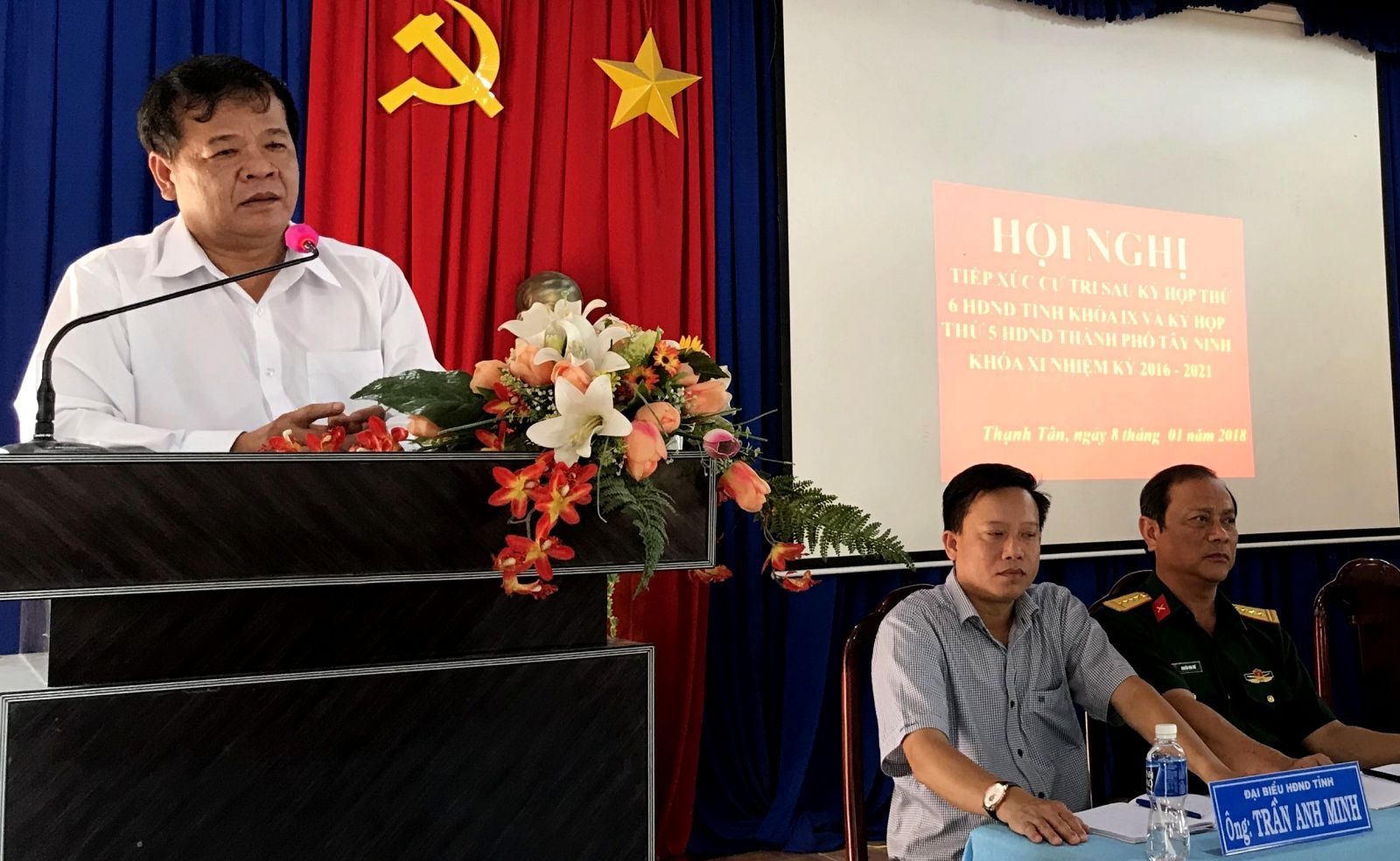 Tiếp tục hoạt động tiếp xúc cử tri sau kỳ họp thứ 6 HĐND tỉnh, sáng 8.1, các đại biểu HĐND tỉnh gồm có ông Phạm Văn Tân- Chủ tịch UBND tỉnh, Nguyễn Văn Trứ- Chỉ huy trưởng Bộ CHQS tỉnh, Trần Anh Minh- Tổng Giám đốc Công ty Cổ phần Du lịch Thương mại Tây Ninh cùng tổ đại biểu HĐND Thành phố có buổi tiếp xúc với cử tri xã Thạnh Tân, thành phố Tây Ninh.