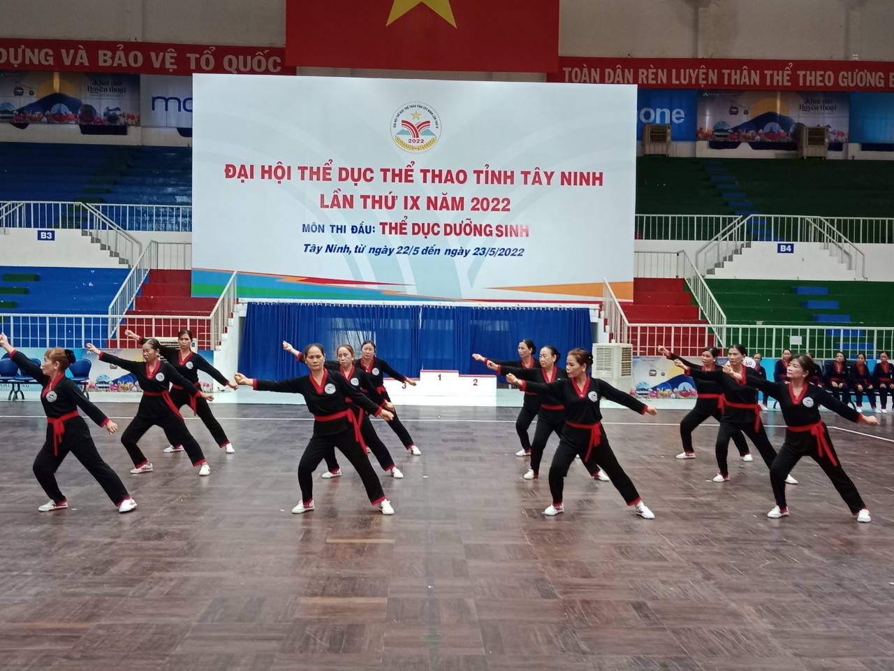 Tiếp tục các môn thi đấu tại Đại hội TDTT tỉnh Tây Ninh lần thứ IX năm 2022, sáng 22.5, tại Nhà thi đấu thể dục thể thao tỉnh, các VĐV tham gia thi môn thể dục dưỡng sinh.