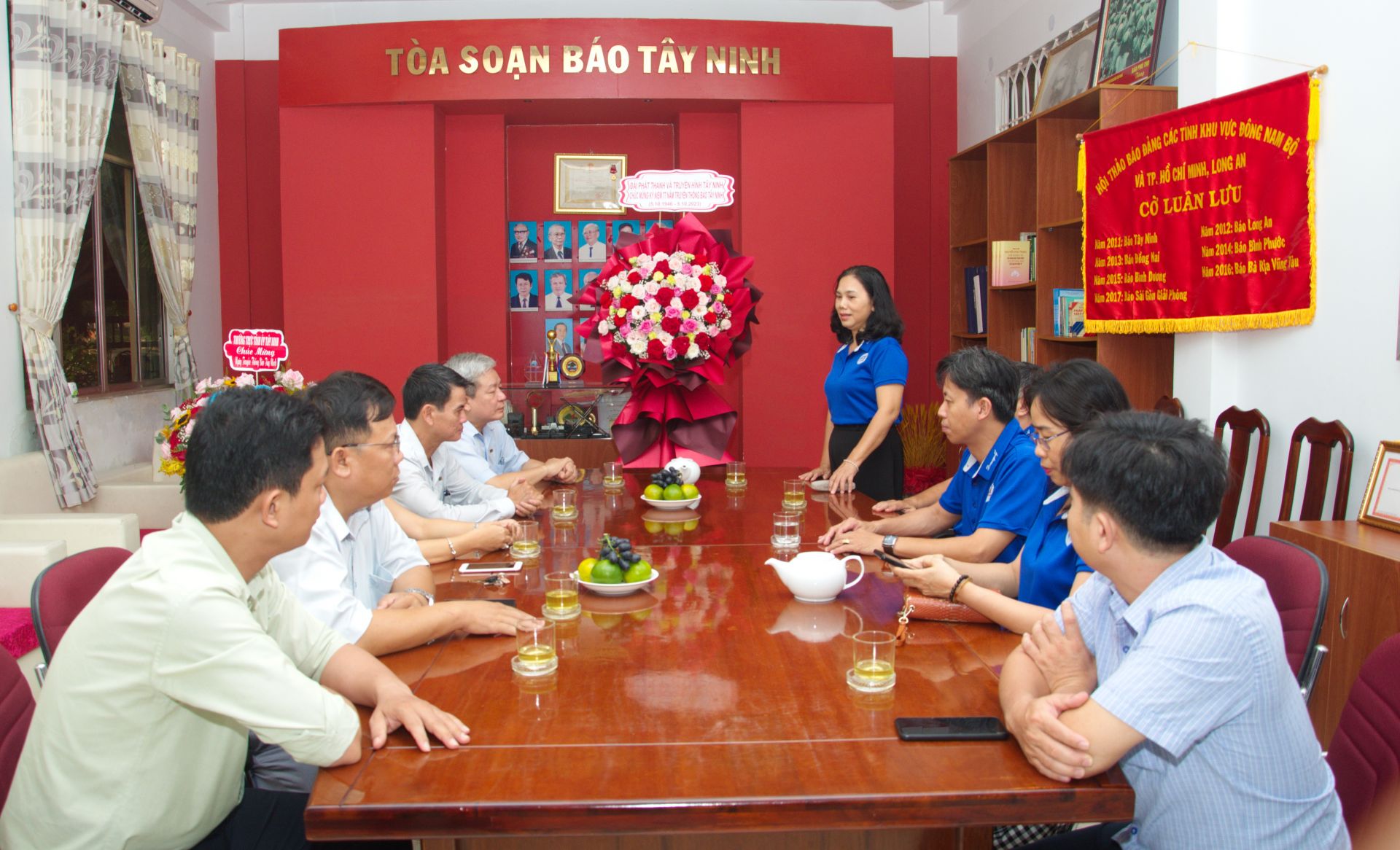 Tiếp đoàn có bà Trần Thị Mỹ Linh- Tổng Biên tập; các ông Đặng Hoàng Thái, Dương Nguyễn Hoàng Anh, Phó Tổng Biên tập cùng lãnh đạo các phòng chuyên môn Báo Tây Ninh.