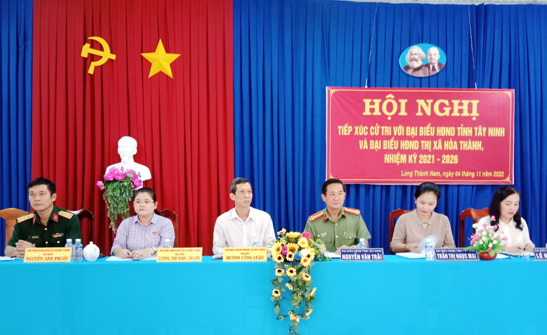 Sáng 4.11, Đại tá Nguyễn Văn Trãi- Giám đốc Công an tỉnh cùng tổ đại biểu HĐND tỉnh và tổ đại biểu HĐND thị xã Hoà Thành tiếp xúc cử tri phường Long Hoa và xã Long Thành Nam.