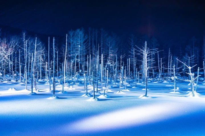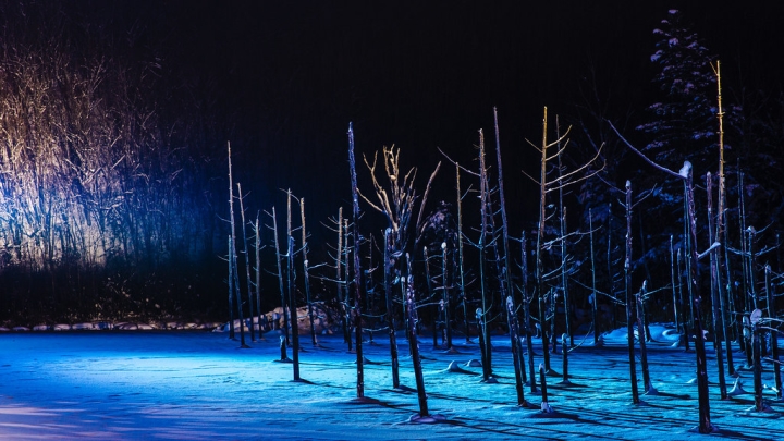 Những cây bạch dương mọc trên ao bị chết chìm một phần, chỉ còn lại hình dạng héo úa và trơ trọi thân cây màu trắng nổi trên mặt hồ. Kết hợp với màu xanh có phần ma mị của hồ vào ban đêm, Shirogane trở thành một khung cảnh có phần buồn bã nhưng lại huyền ảo và lung linh muôn phần.