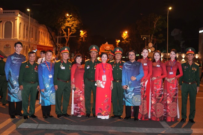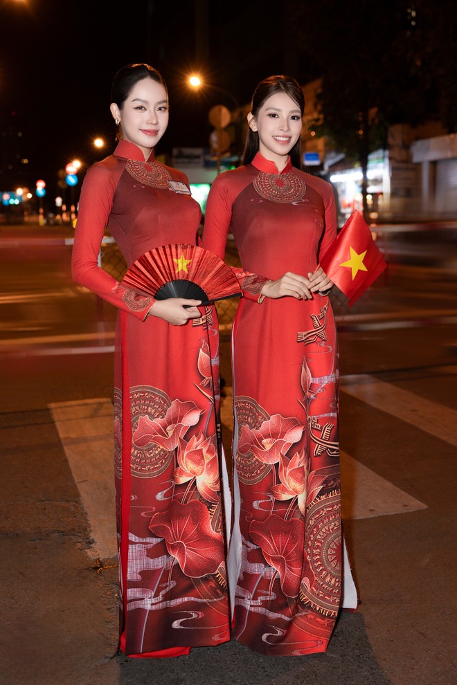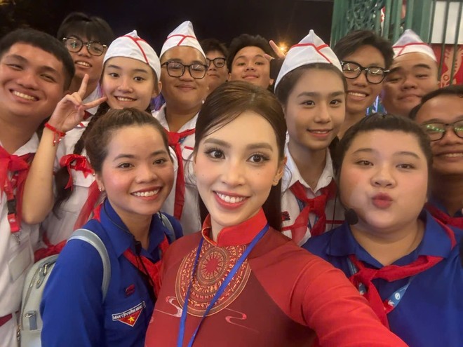 Hoa hậu Tiểu Vy mặc trang phục áo dài do Ban tổ chức chuẩn bị, xuất hiện từ sớm cùng gia đình. Cô cho biết ba mẹ và em trai đã vào TP.HCM để hưởng ứng đại lễ cũng như cổ vũ con gái tại hoạt động diễu binh diễu hành. Cả gia đình nàng hậu thể hiện tinh thần yêu nước khi khoác trên mình chiếc áo cờ đỏ sao vàng.