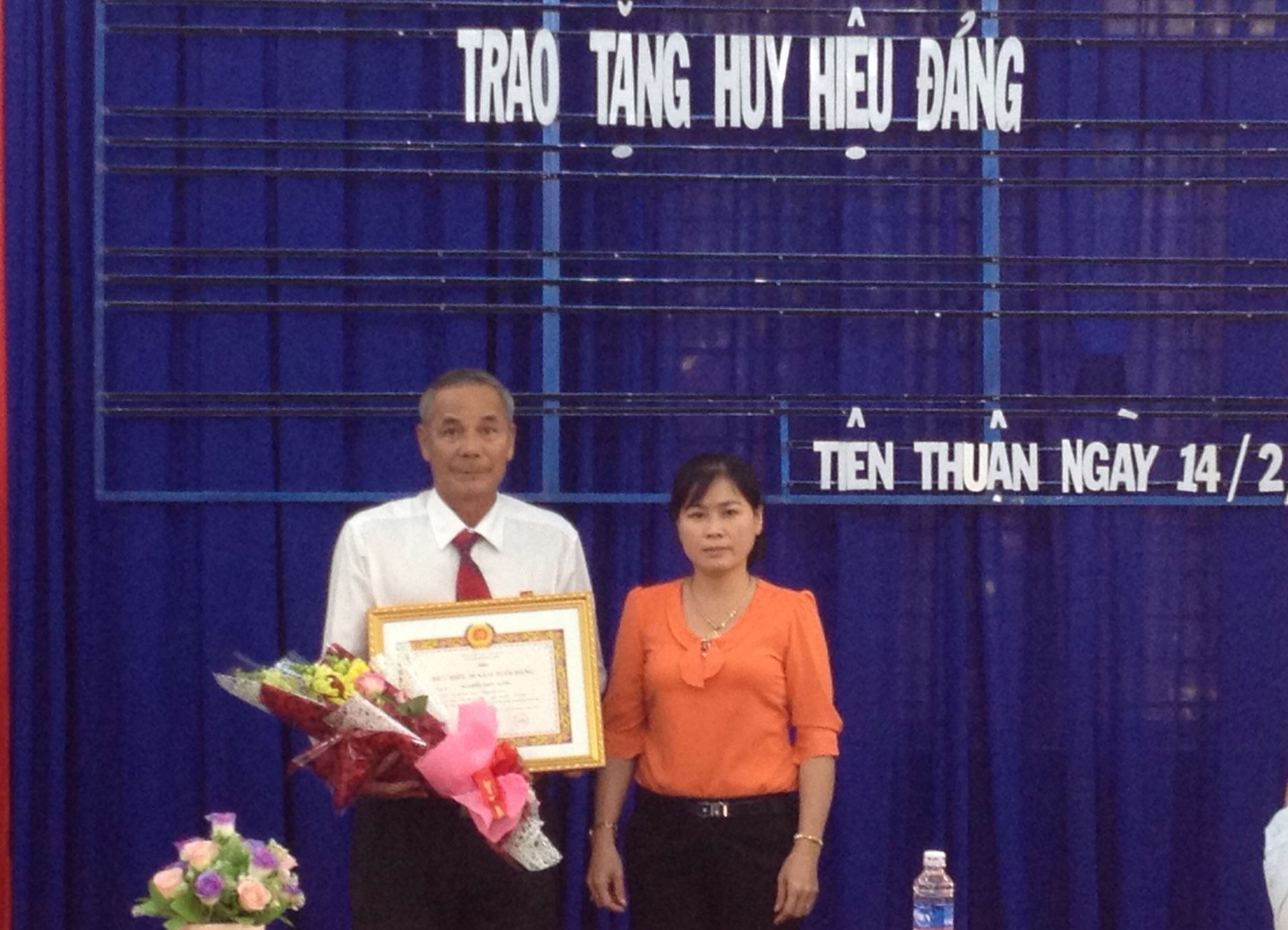 Bà Nguyễn Thị Mai- Trưởng ban Tuyên giáo Huyện ủy Bến Cầu trao Huy hiệu 30 năm tuổi Đảng cho đảng viên Nguyễn Phúc Danh.