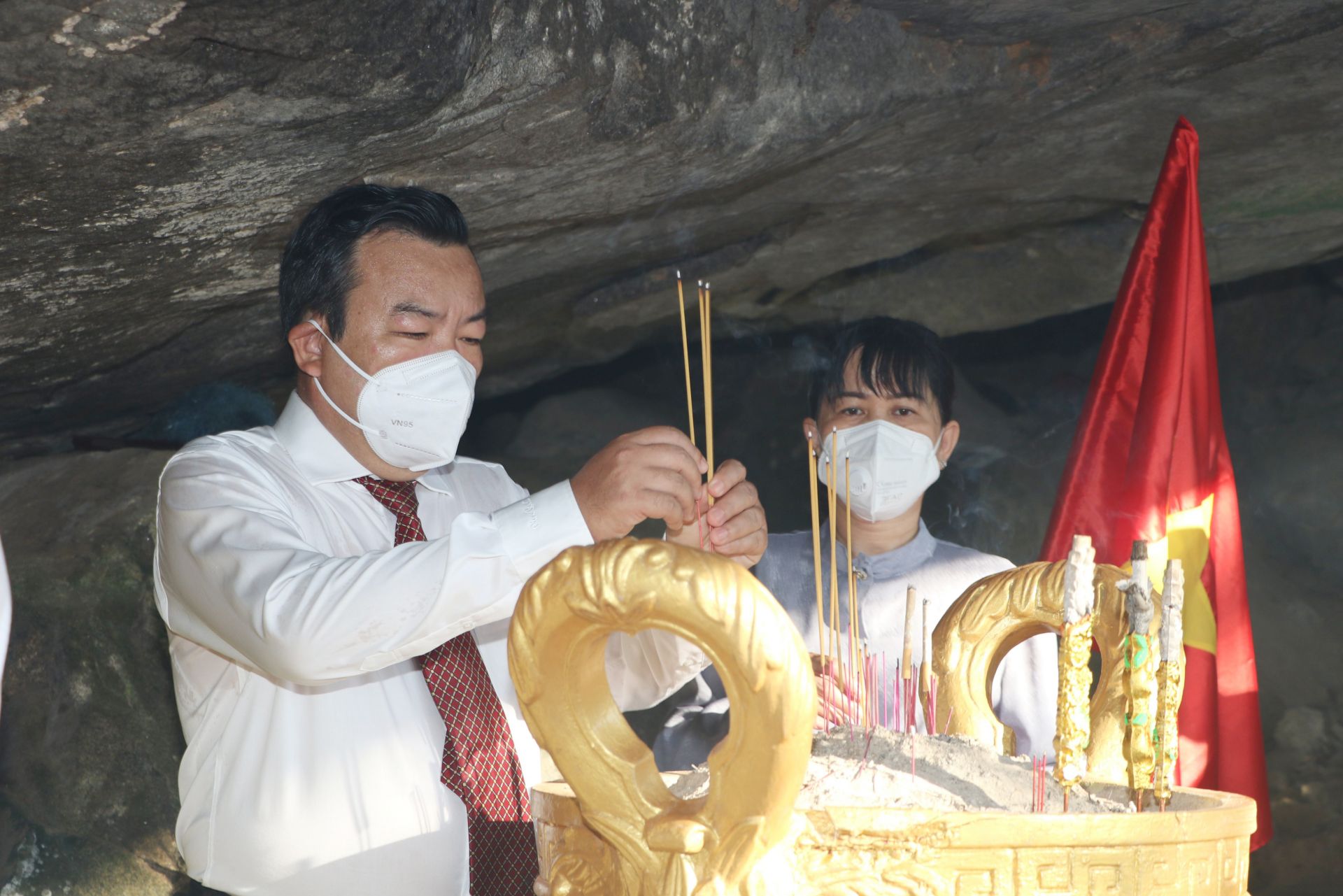 Phó Bí thư Thường trực Tỉnh uỷ Phạm Hùng Thái và Phó Chủ tịch Thường trực HĐND tỉnh Nguyễn Đài Thy dâng hương tại căn cứ Động Kim Quang.