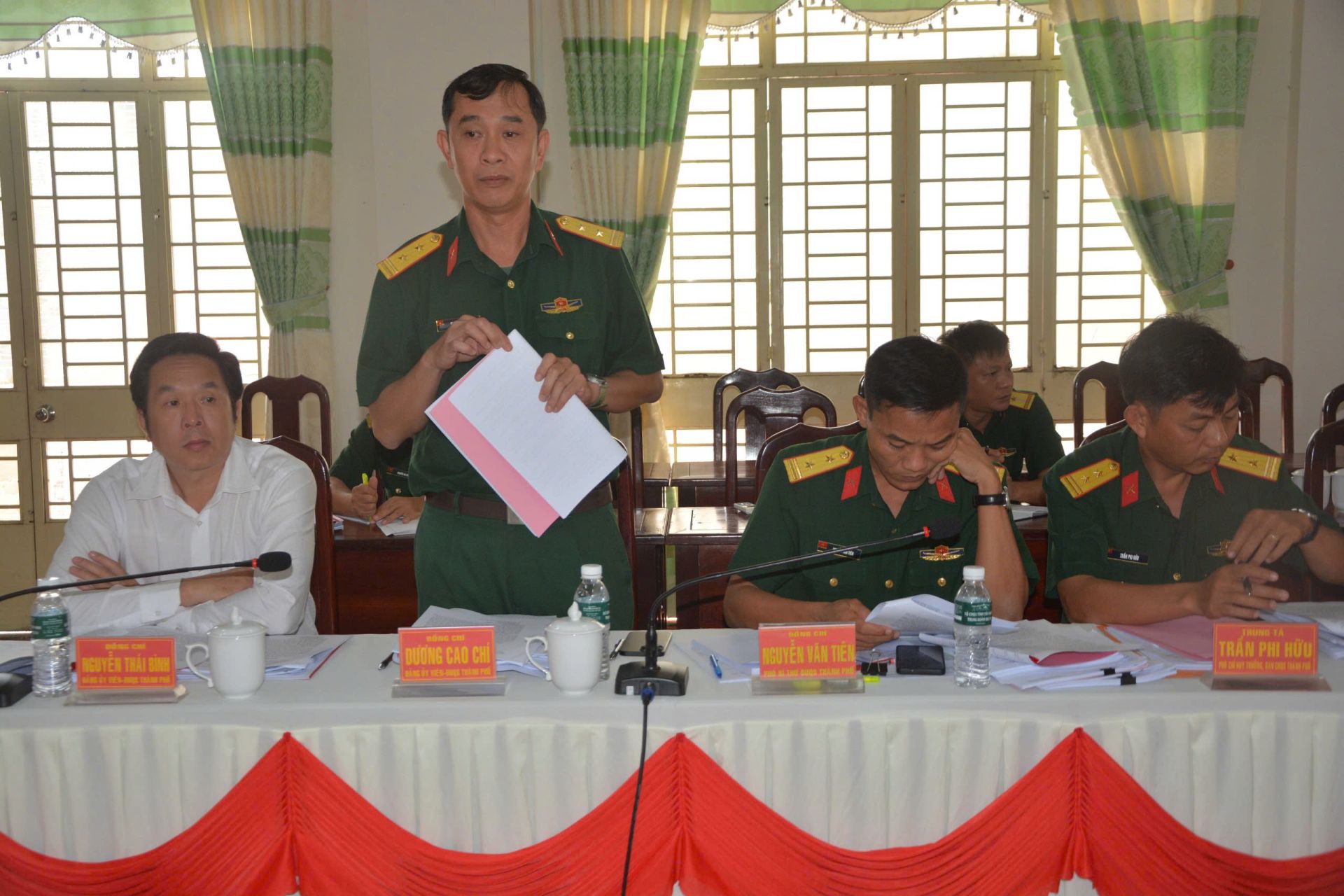 Đến dự có Thượng tá Nguyễn Quốc Duy- Phó Chủ nhiệm Ủy ban Kiểm tra Đảng ủy Quân sự tỉnh; ông Nguyễn Thái Bình- Chủ tịch UBND thành phố; Bí thư Đảng ủy, Chỉ huy trưởng Ban CHQS các xã, phường trên địa bàn thành phố.