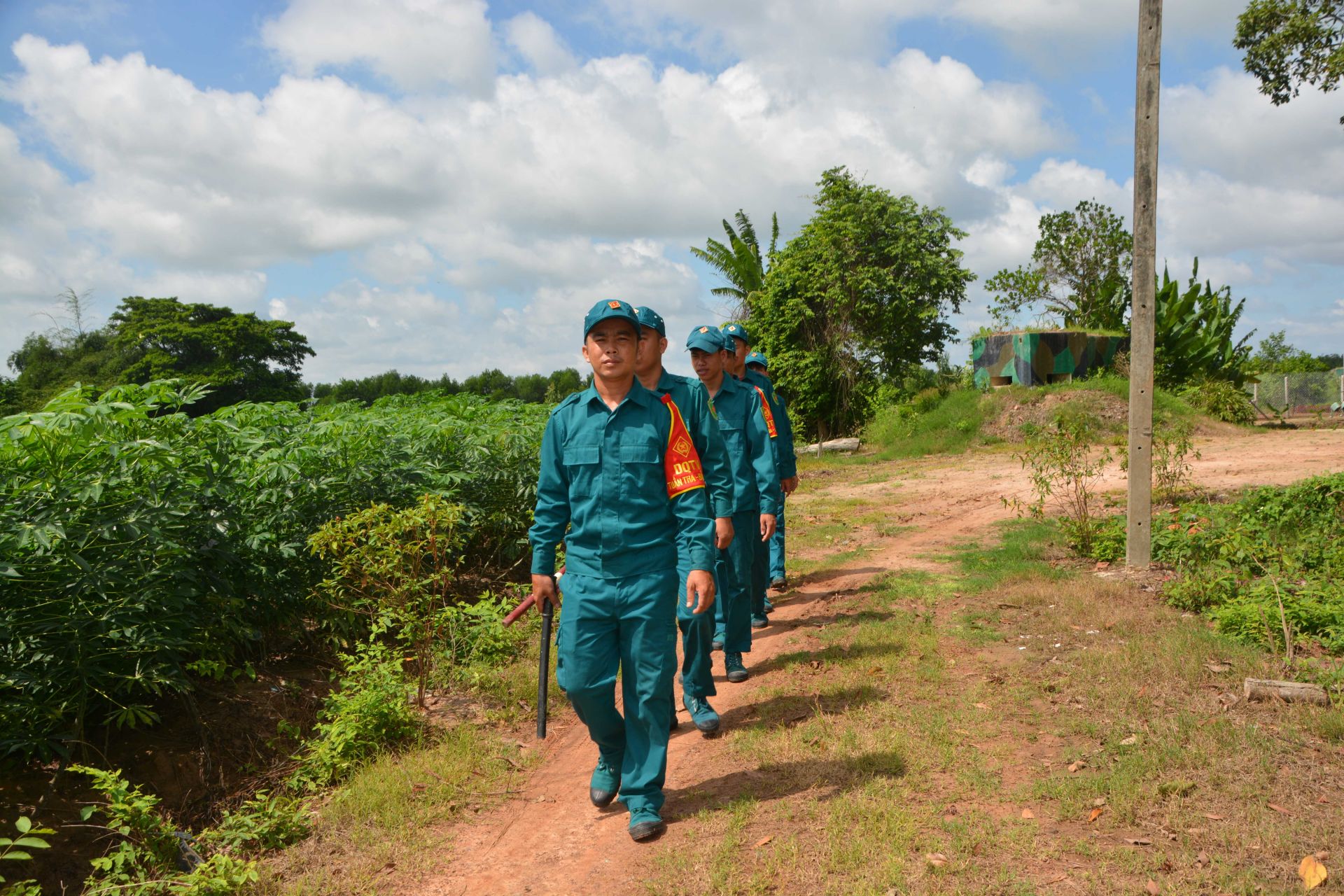 Cán bộ, chiến sĩ chốt dân quân chiến đấu thường trực Phước Tây, xã Long Phước, huyện Bến Cầu tuần tra bảo vệ biên giới.