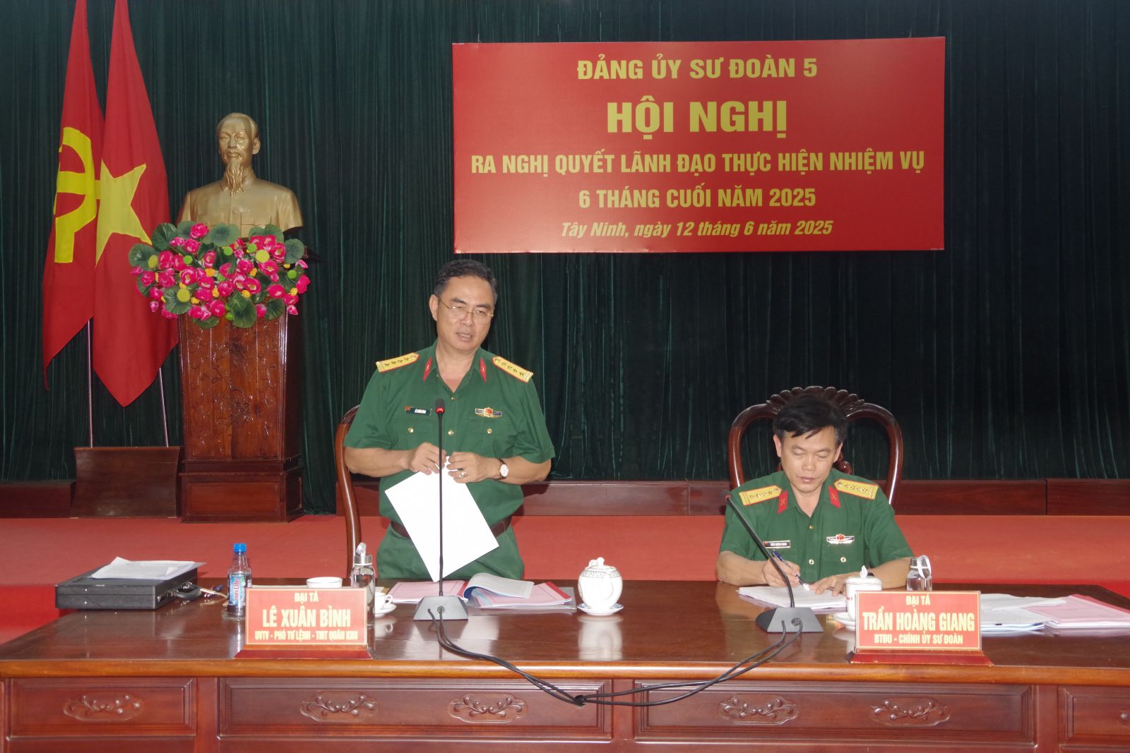 Phát biểu chỉ đạo hội nghị, Đại tá Lê Xuân Bình, Phó Tư lệnh, Tham mưu trưởng Quân khu đánh giá Sư đoàn 5 đã hoàn thành và vượt chỉ tiêu, nghị quyết 6 tháng đầu năm 2025, một số nhiệm vụ hoàn thành xuất sắc nổi bật như: SSCĐ, huấn luyện, công tác hậu cần, kỹ thuật, tham gia hội thi, hội thao các cấp đạt giải cao, đặc biệt tham gia khối diễu binh, diễu hành kỷ niệm 50 Ngày giải phóng miền Nam, thống nhất đất nước hoàn thành xuất sắc nhiệm vụ .