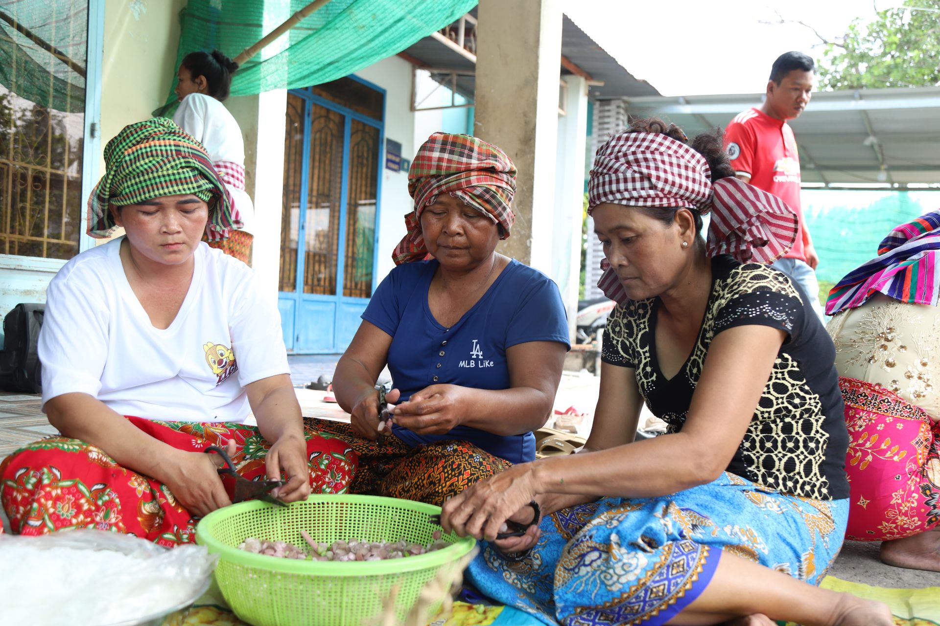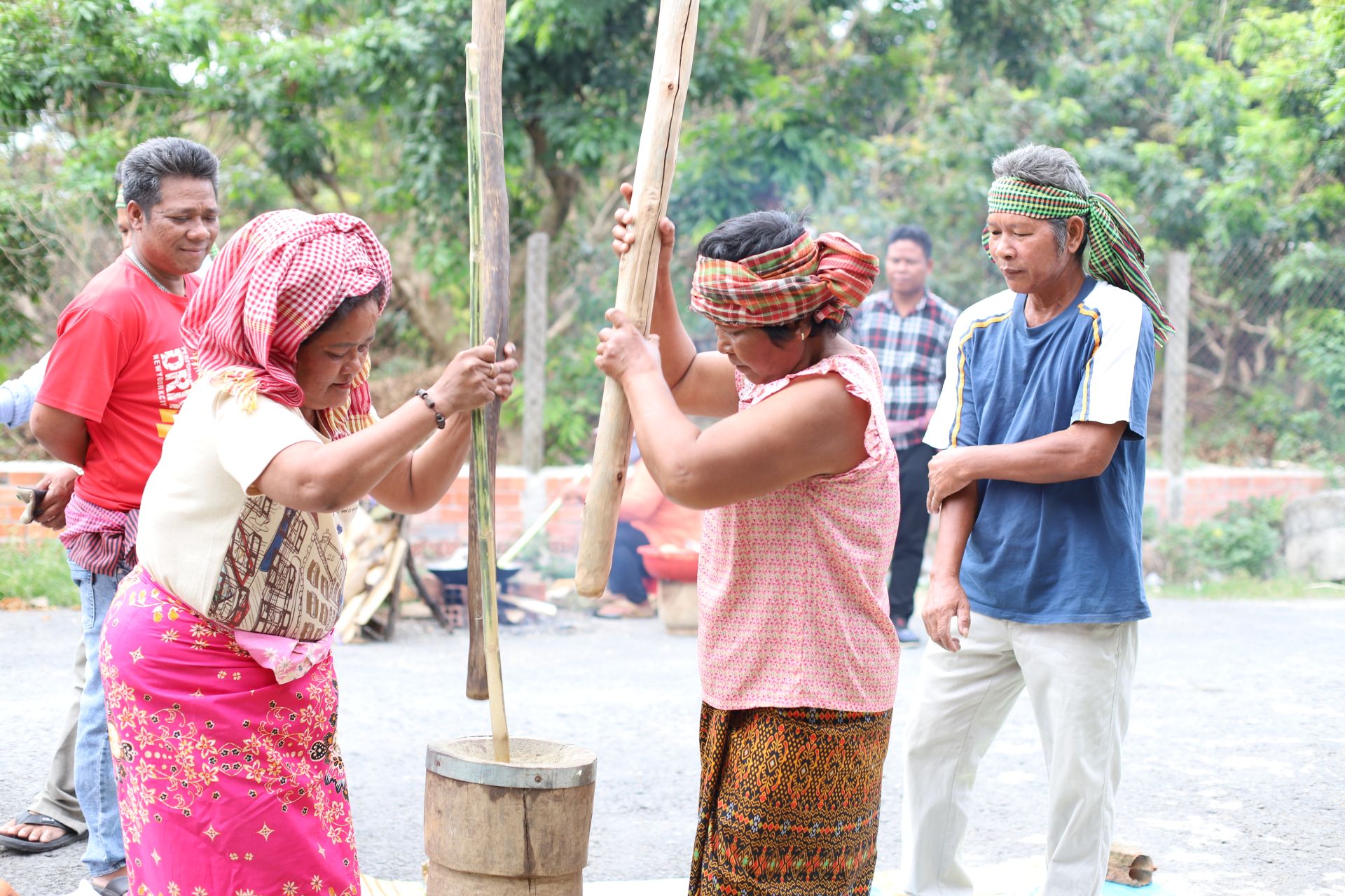 Bà con Khmer ở Bàu Ếch giã cốm dẹp trong lễ Ok Om Bok.