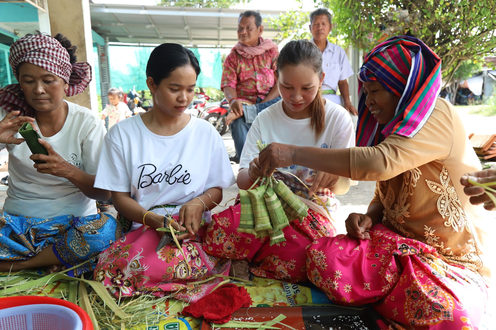 Bà Cao Thị PhoLa- người có uy tín của đồng bào Khmer ở Trường Tây (bìa phải) hướng dẫn các bạn trẻ gói bánh tét thốt nốt.