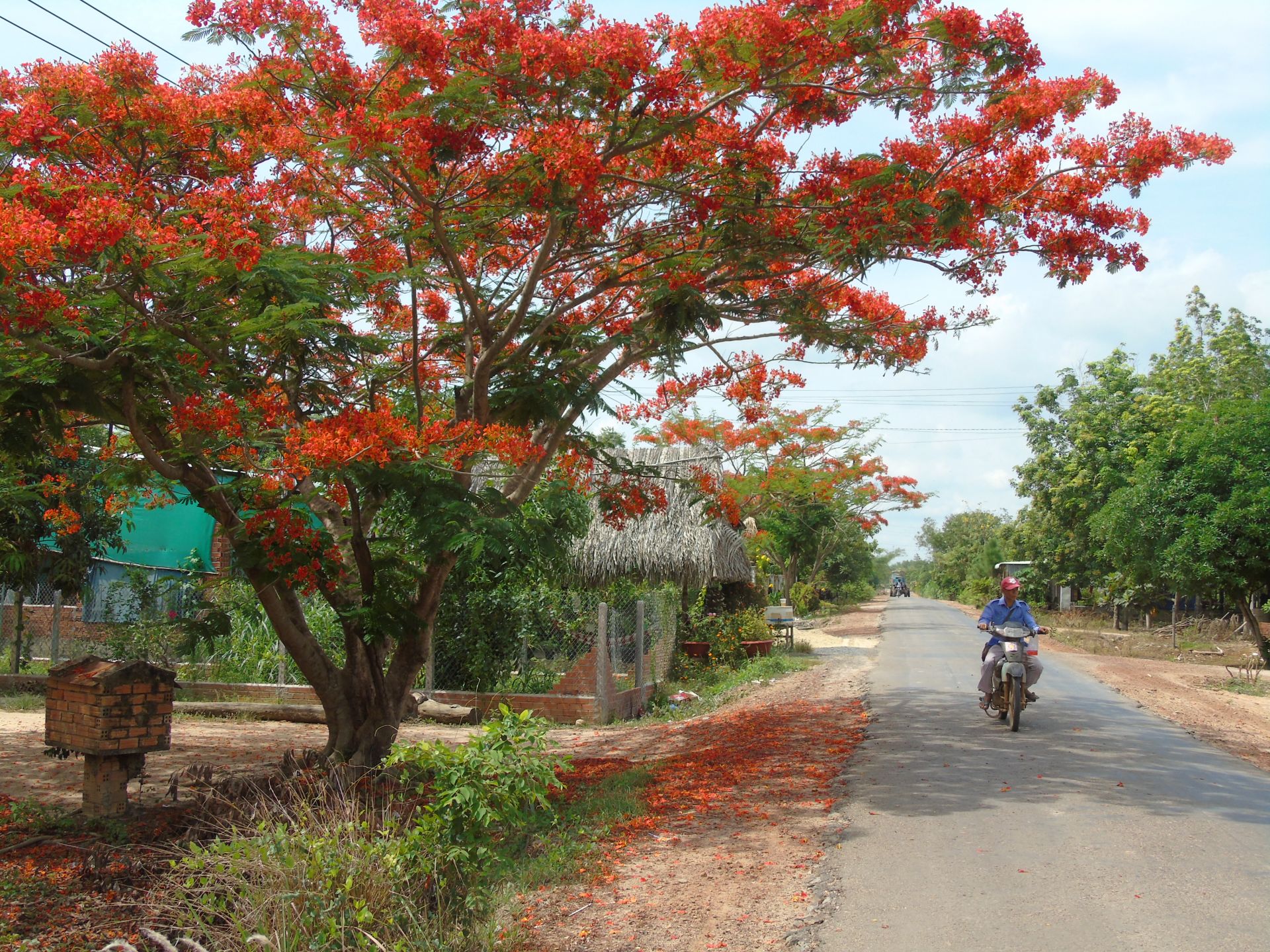 Các trường học thì co cụm bên ấp Hoà Bình, tất cả đều chói đỏ màu hoa phượng. Trung tâm Văn hoá, Thể thao và Học tập cộng đồng ở ấp Lưu Văn Vẳng vẫn còn tươi mới màu sơn. Tôi đứng lặng trước cây bằng lăng trồng ở sân Trung tâm, thân cây đẹp sáng gồ ghề như đá núi mà những chùm bông như thể hoa tường vi chúm chím tươi hồng.