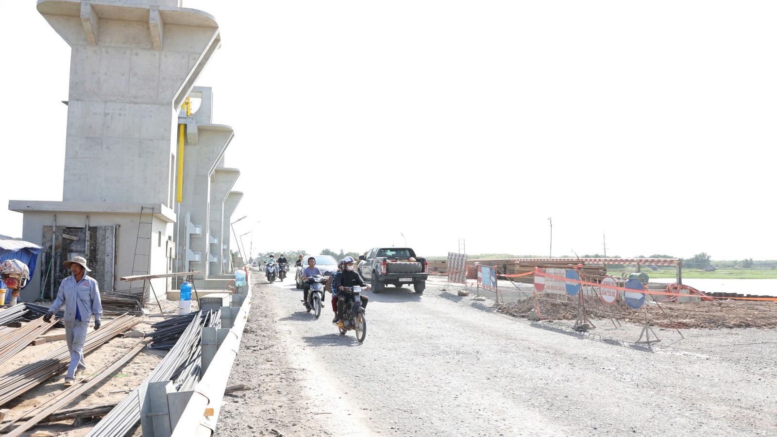 Ông Lê Hồng Nghị, cán bộ kỹ thuật của nhà thầu cho biết, hiện tại dự án đạt 80% kế hoạch về mặt hệ thống tràn xả lũ, riêng cầu giao thông và đường đã hoàn thiện. Do phải chờ lún theo kỹ thuật thiết kế, trong thời gian này đơn vị thi công tưới nước thường xuyên để hạn chế bụi, ô nhiễm môi trường đối với khối đất đắp mới hoàn thiện hai bên mang tràn.