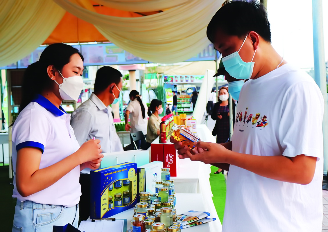 Người dân đến tham quan, mua sắm tại một gian hàng của hội chợ.