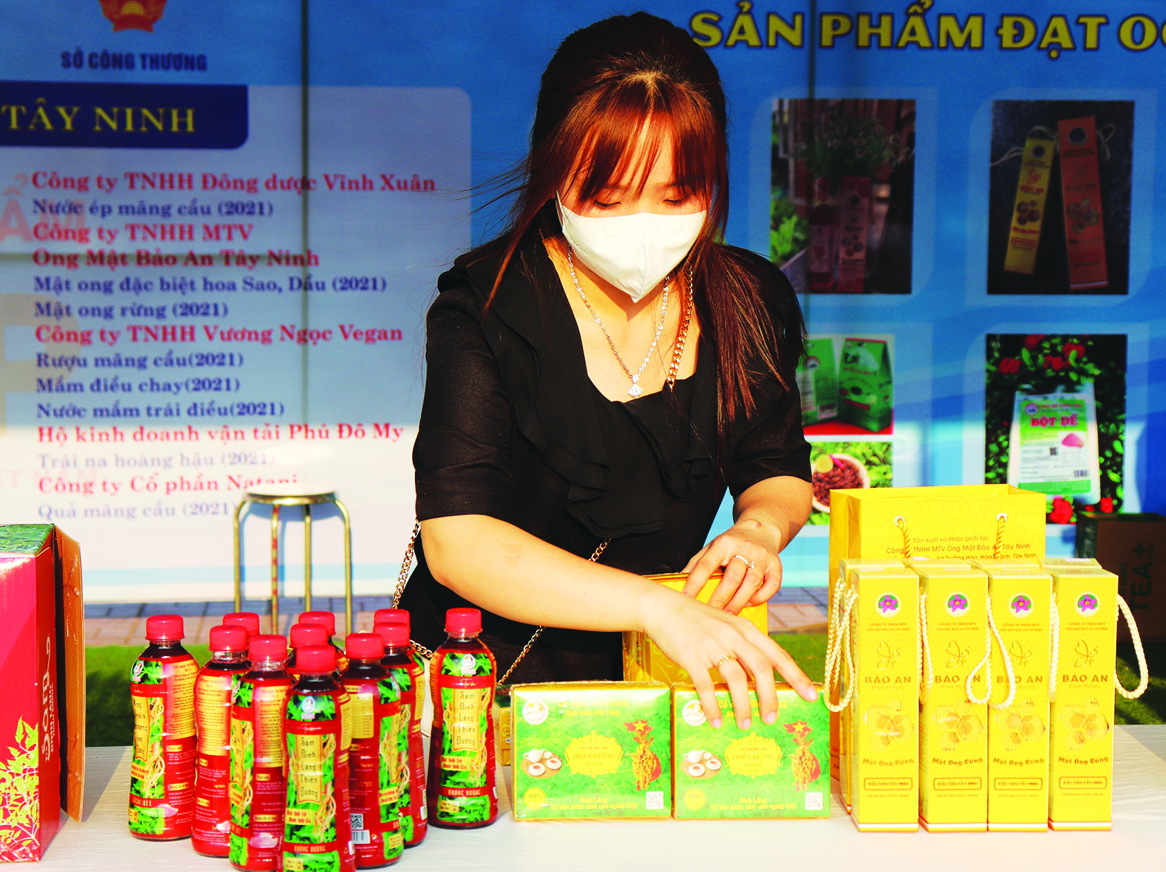Nhân viên sắp xếp sản phẩm tại một gian hàng ở hội chợ giới thiệu, quảng bá các sản phẩm OCOP và đặc sản thị xã Hoà Thành.