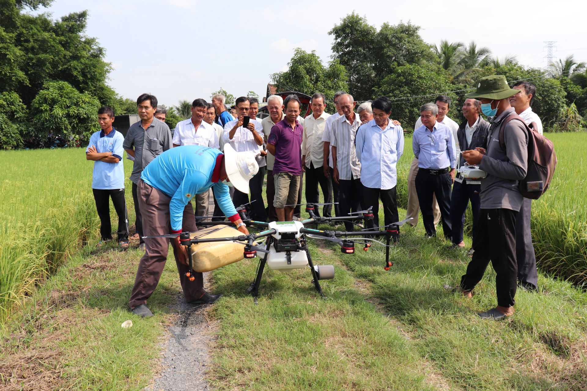 Nông dân xem thiết bị bay không người lái phun thuốc BVTV trên ruộng lúa.