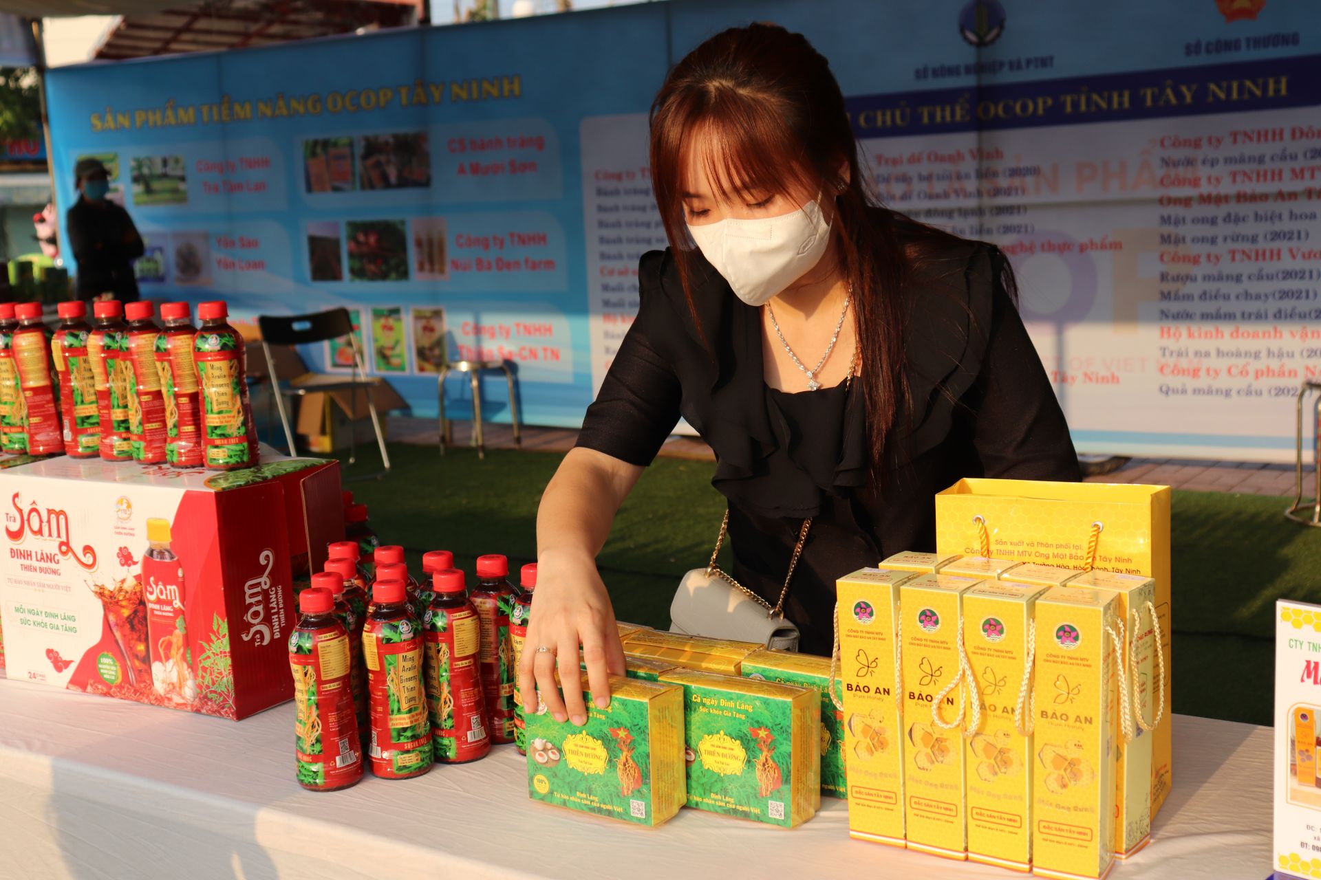 Một gian hàng tại Hội chợ giới thiệu, quảng bá sản phẩm OCOP và đặc sản thị xã Hoà Thành, năm 2022.