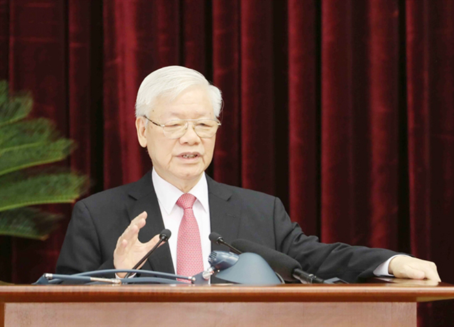 Tổng Bí thư Nguyễn Phú Trọng phát biểu tại Hội nghị Trung ương 2, khóa XIII. Ảnh TTXVN