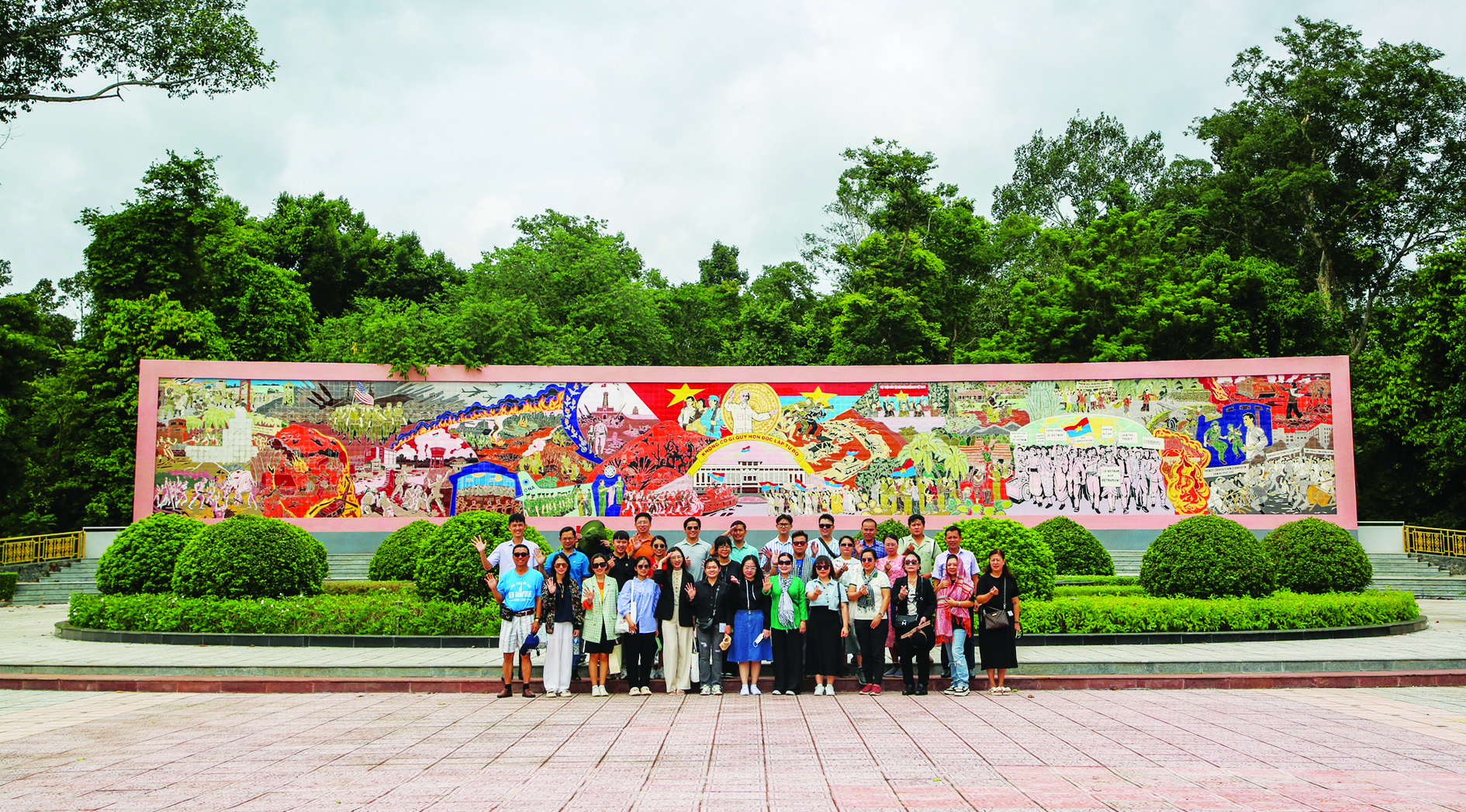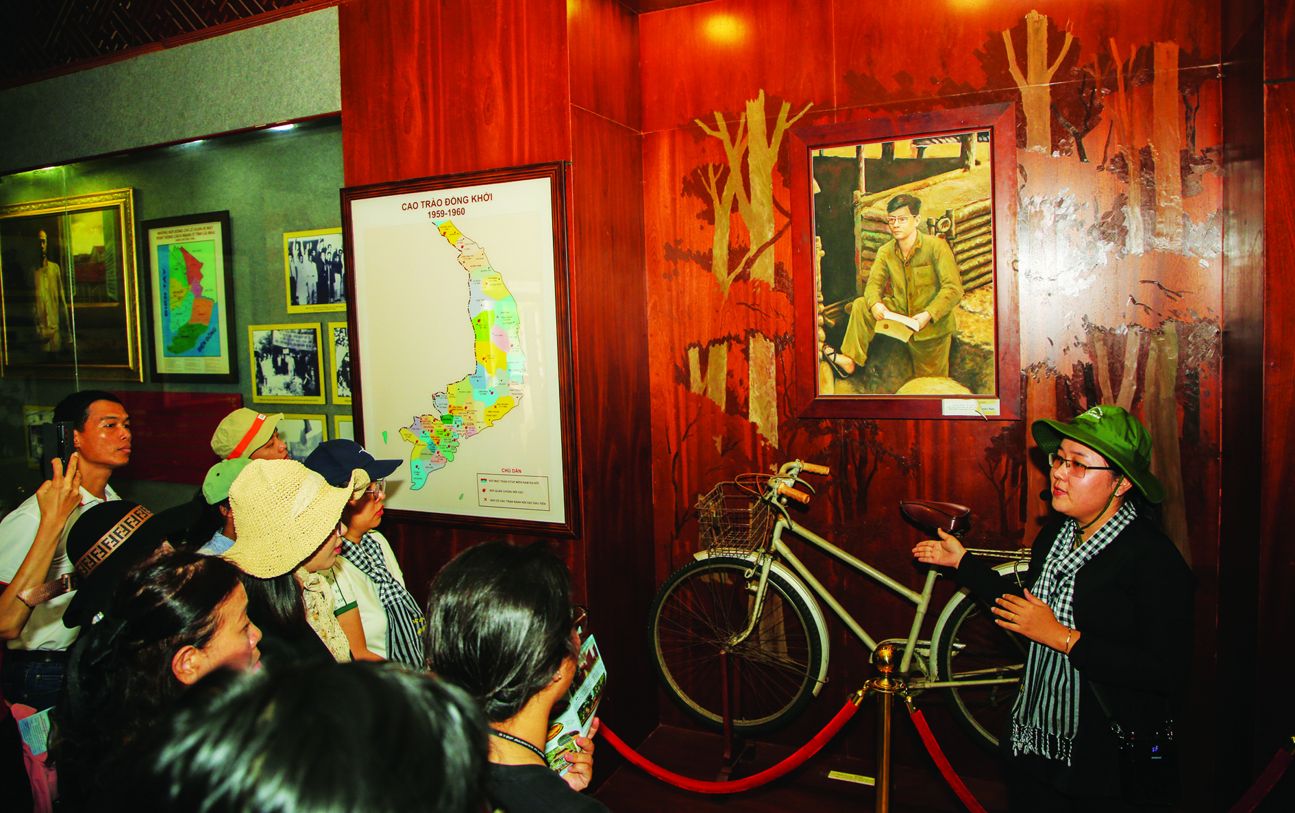Du khách chụp ảnh tại Bức tranh hoành tráng trong di tích lịch sử quốc gia đặc biệt Căn cứ Trung ương Cục miền Nam.