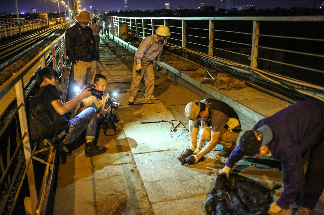 Phóng viên ảnh ghi lại quá trình tu sửa cầu Long Biên, Hà Nội. (Ảnh: Minh Sơn/Vietnam+)