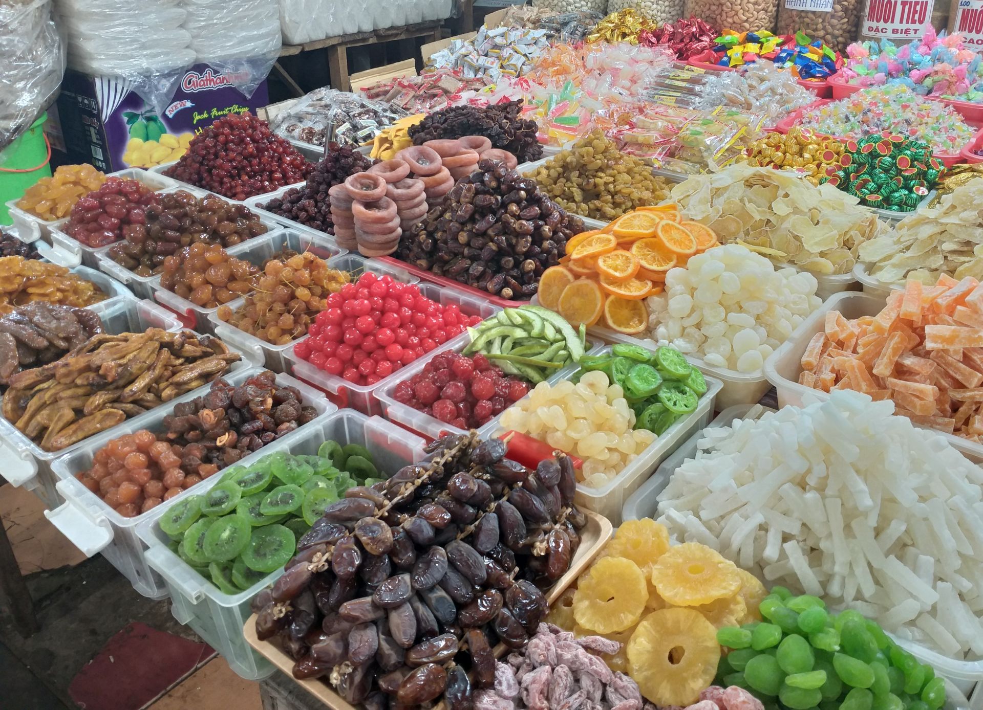 Mứt tết đủ loại, với màu sắc sặc sỡ, không được che đậy kỹ tại chợ Long Hoa.