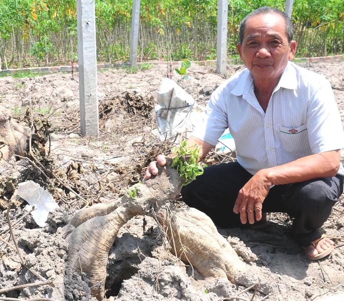 Ông Đinh Xuân Phượng, 68 tuổi, ở ấp Thạnh Nghĩa là người gắn bó với nghề trồng sắn suốt 5 năm qua. Hiện tại, ông có 4 công đất chuyên dành để trồng loại cây này. Sắn của ông đã tới kỳ thu hoạch từ hơn một tháng nay, nhưng thương lái thu mua quá chậm, khiến nhiều gốc sắn bị khô dây, thối củ.