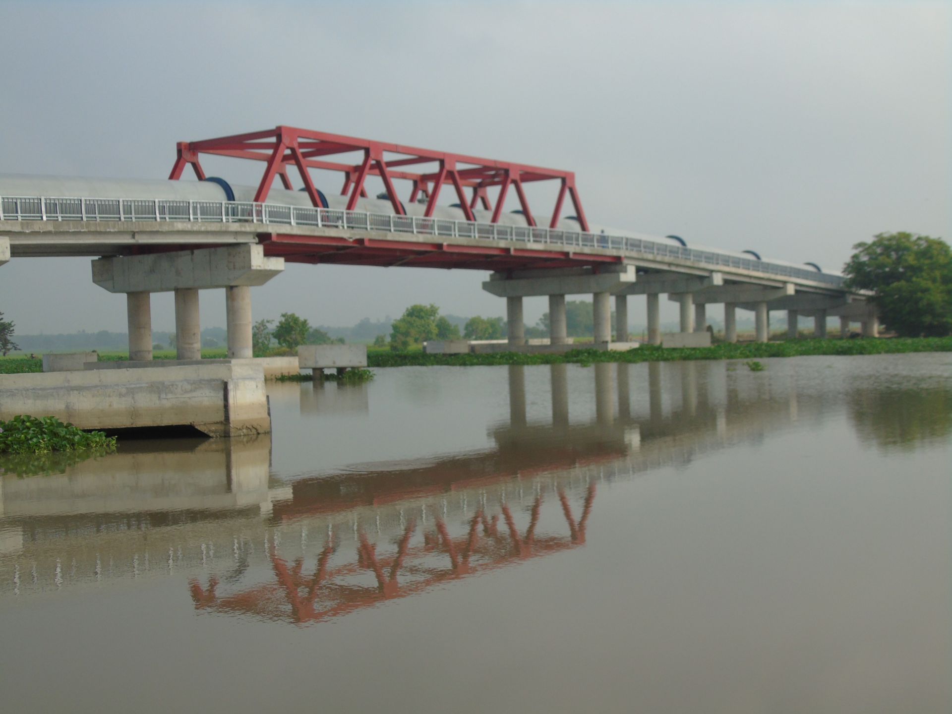 Tất cả in bóng xuống mặt sông, như thể một cô con gái nhà ai, đang yểu điệu nghiêng người xuống để soi gương. Lúc này cũng là khi sương mù đã bớt, để lộ ra những khoảng trời còn lơ mơ màu xanh nhạt, với những đám mây bông phảng phất màu hồng. Như là mây cũng vừa được phản chiếu màu của khung thép đỏ, đang nổi bật một mình lặng lẽ giữa dòng sông.