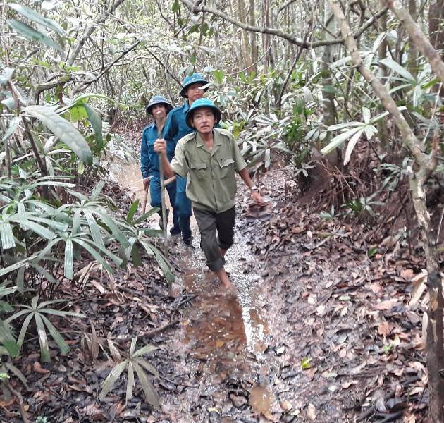 Đường tuần tra nước ngập mất lối đi, xe của cán bộ đi tuần phải bỏ lại bên ngoài, cả đoàn lội bộ nhiều cây số, có chỗ nước ngập sâu quá đầu gối. Nước đen ngòm, lá cây mục gặp nước bốc mùi ngai ngái, nhiều chỗ đường trơn trượt đi bộ cũng té lên, té xuống.