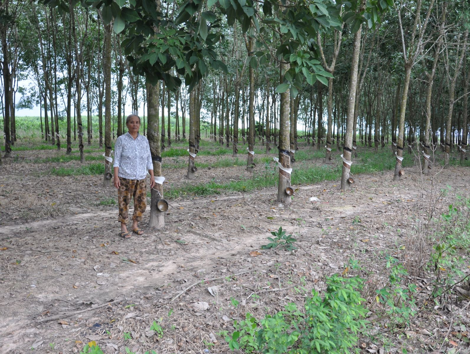 Bà Ðinh Thị Lệ với vườn cao su được bón phân hơn 1 tháng nhưng không có kết quả như quảng cáo.