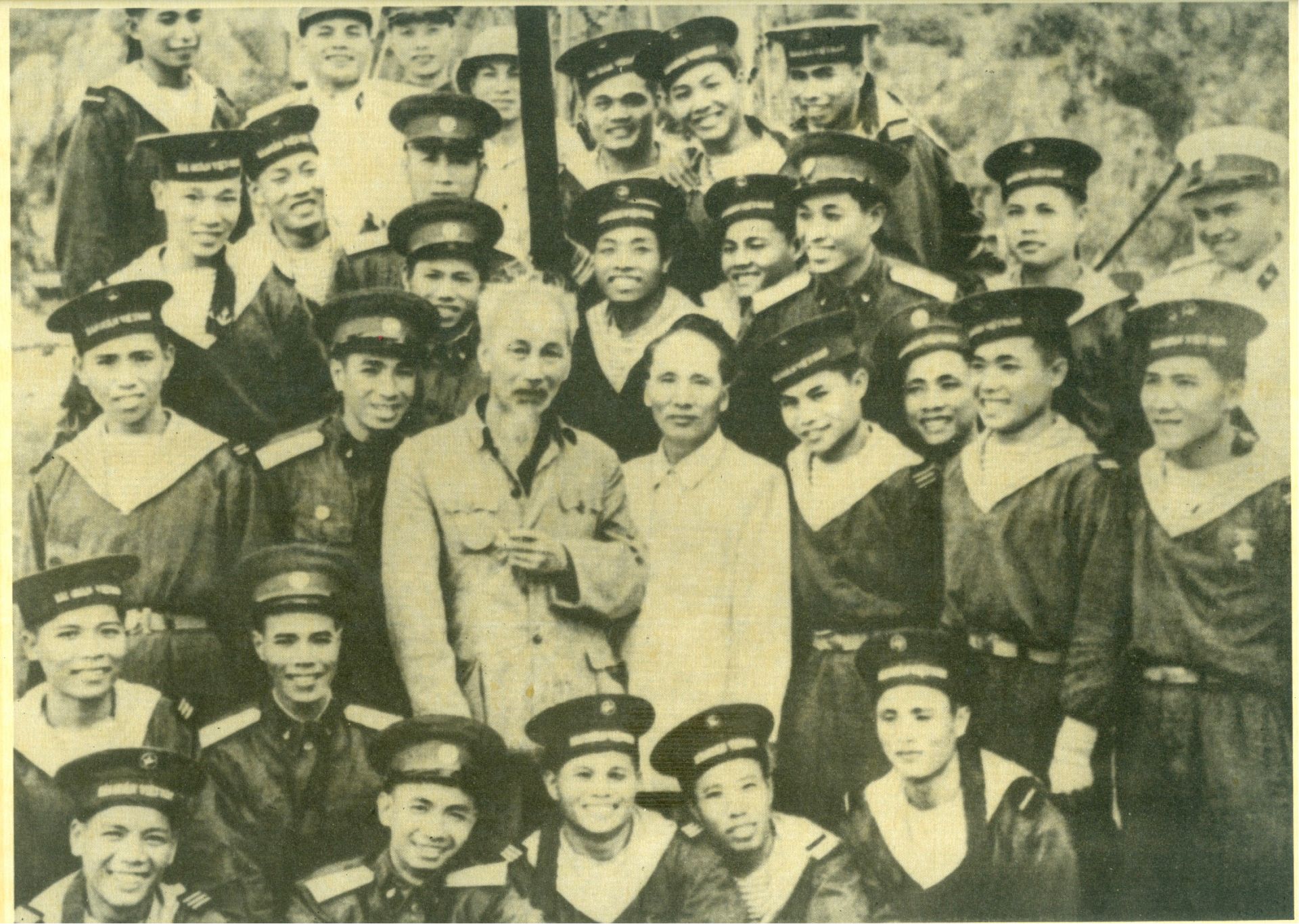 Chủ tịch Hồ Chí Minh và đồng chí Nguyễn Lương Bằng thăm bộ đội Hải quân năm 1959. Ảnh tư liệu