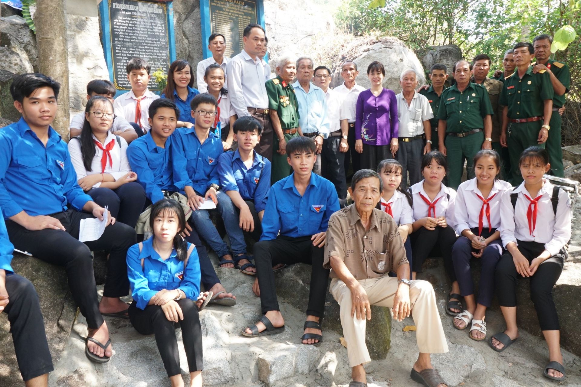 Lãnh đạo huyện, xã và các đại biểu chụp ảnh lưu niệm trước căn cứ Suối Môn.