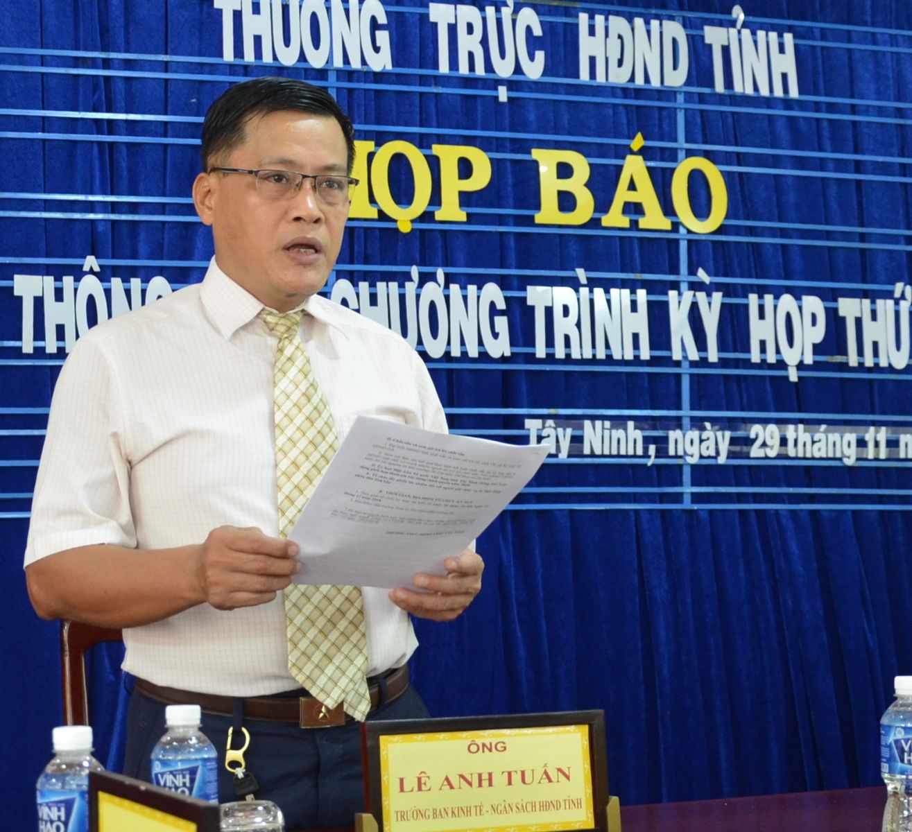Ông Lê Anh Tuấn, Trưởng Ban Kinh tế - Ngân sách HĐND tỉnh chủ trì cuộc họp báo thông tin về kỳ họp thứ 10, HĐND tỉnh khoá IX.