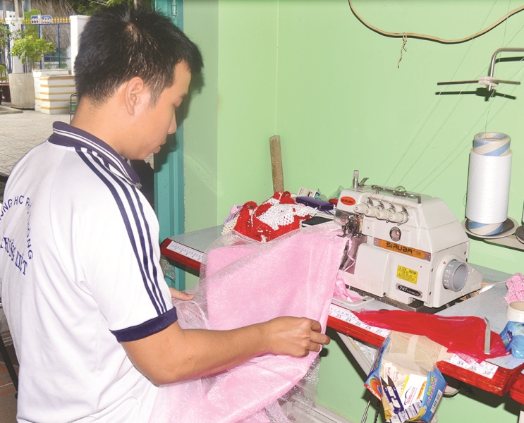 Một nhân viên shop Bullstore (TP.Tây Ninh) may sản phẩm bán trên mạng xã hội.