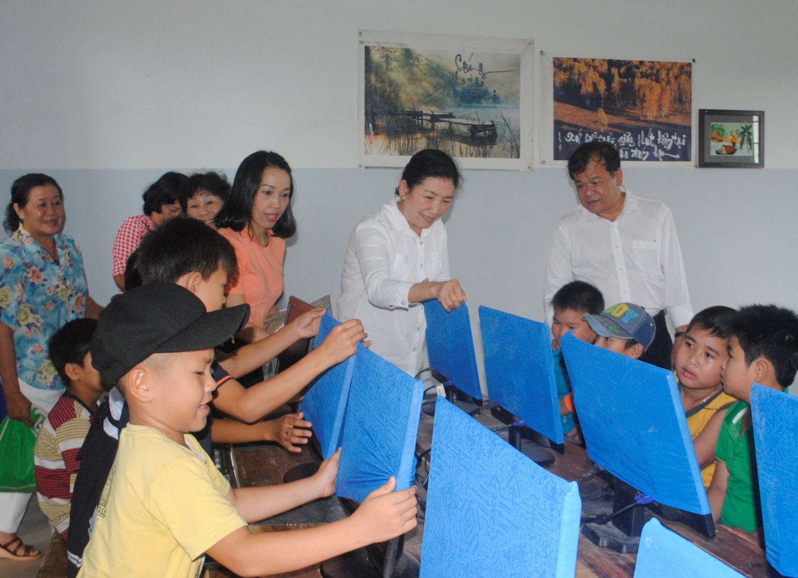 Chủ tịch UBND tỉnh Phạm Văn Tân thăm phòng vi tính do CLB Nữ doanh nhân tài trợ cho Trường TH Long Chữ A (xã Long Chữ, huyện Bến Cầu) tháng 7.2017. Ảnh: Ngô Tuyết