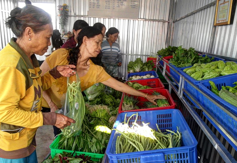 Người tiêu dùng mua rau tại Cửa hàng rau an toàn Long Mỹ (Hoà Thành). Ảnh: Thanh Nhi