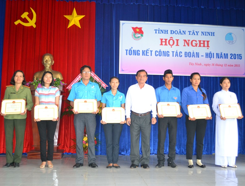 Phó Bí thư Thường trực Tỉnh uỷ Nguyễn Minh Tân tặng bằng khen của UBND tỉnh cho các tập thể Hội LHTN Việt Nam. Ảnh: Hoàng Trương