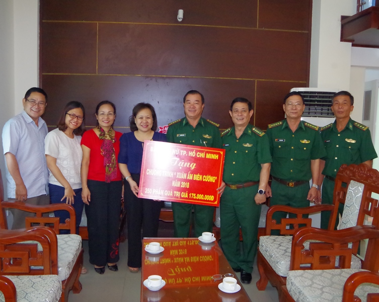 Bà Tạ Thị Nam Hồng- Phó tổng Biên tập Báo Phụ nữ thành phố Hồ Chí Minh trao biển tượng trưng 350 phần quà cho Bộ Chỉ huy BĐBP tỉnh Tây Ninh.