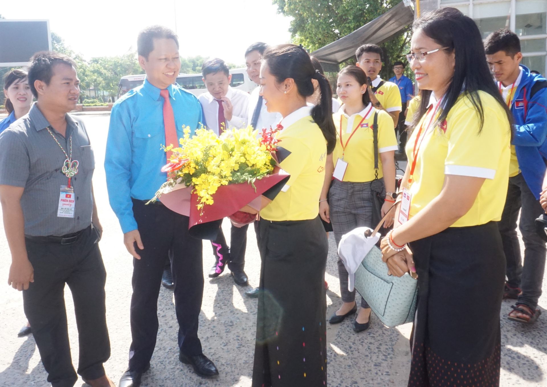 Đại diện thanh niên Việt Nam- anh Cao Hồng Hưng tặng hoa chào mừng cho chị Sroy Socheath- đại diện thanh niên Campuchia.