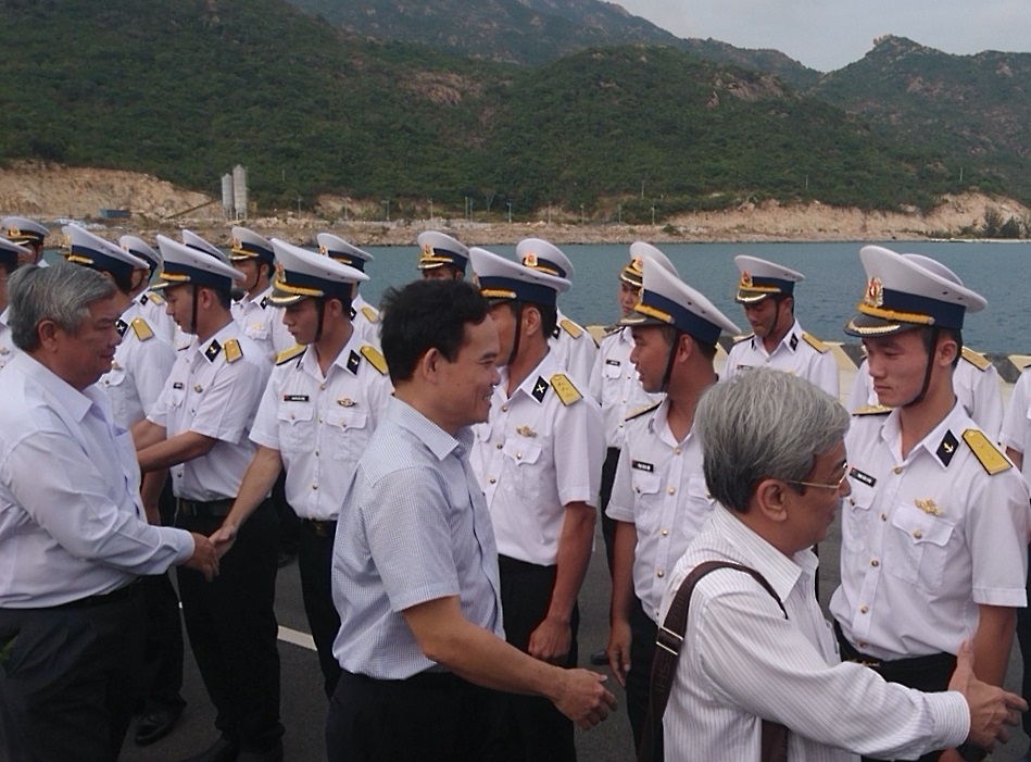 Bí thư Tỉnh uỷ Trần Lưu Quang (giữa) bắt tay chào cán bộ, chiến sĩ Hải quân Vùng 4 trước khi lên tàu.