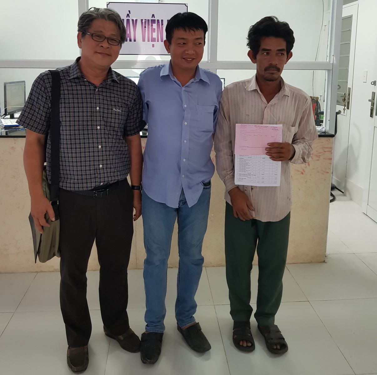 Bác sĩ Liêu Chí Hùng, ông Lê Hữu Phước (giữa) hỗ trợ tiền viện phí cho 1 bệnh nhân nghèo.