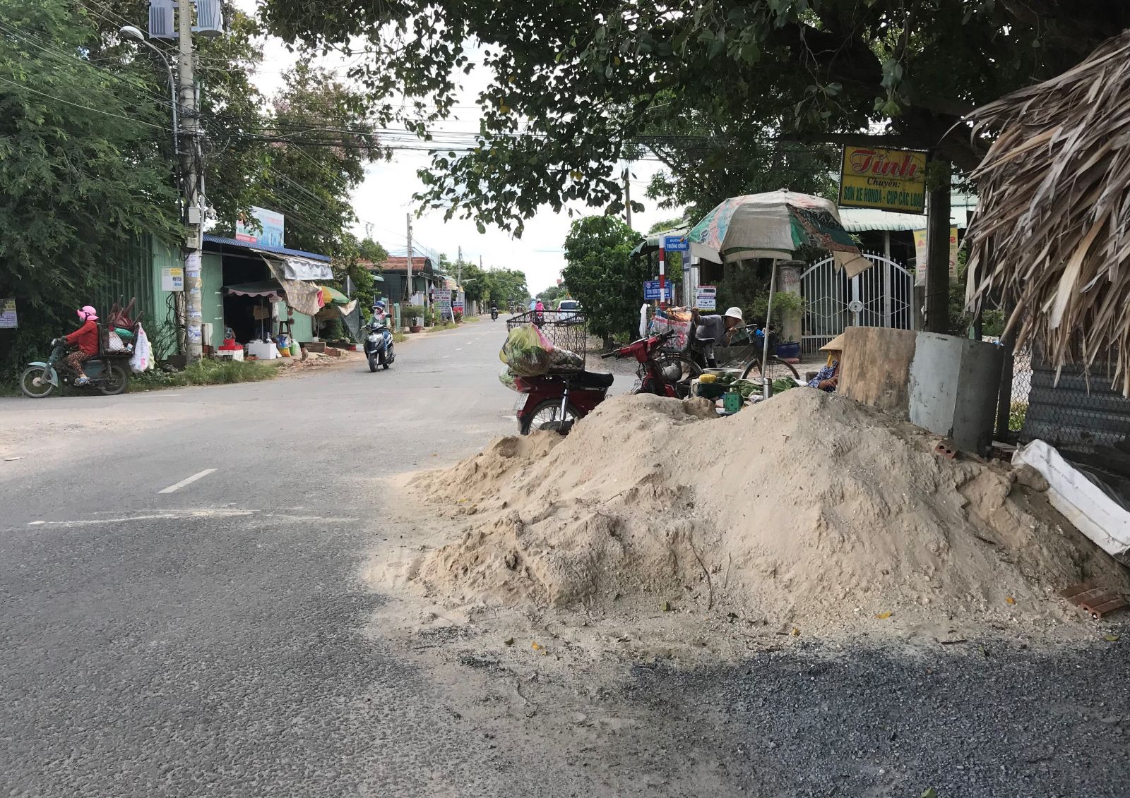 Ðống cát nằm giữa đường, gây cản trở giao thông và tiềm ẩn tai nạn.