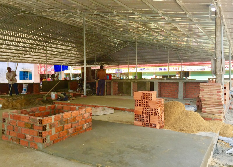 Các tiểu thương tự ý kéo vật liệu để xây chỗ bán tại dãy nhà lồng phía Nam của chợ.