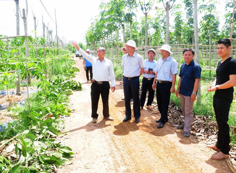 Ông Còn (bìa trái) giới thiệu vườn chanh dây của mình với Công ty Đồng giao và lãnh đạo Sở NN&PTNT.