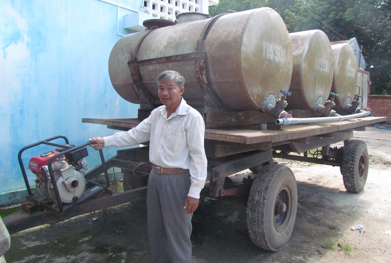 Giám đốc Nông trường Cao su Bến Củi Nguyễn Văn Tài bên công trình “Cải tiến xe vận chuyển mủ cao su thành xe chữa cháy”.