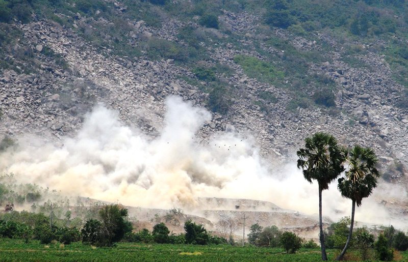 Nổ mìn, thực hiện đề án đóng cửa mỏ khai thác đá trên núi Bà Ðen. (Ảnh: Phạm Thanh Tân)